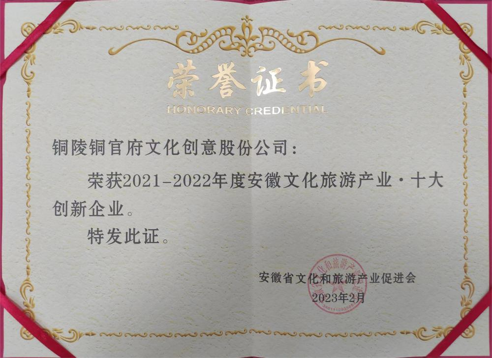 日前,由安徽省文化和旅游產(chǎn)業(yè)促進(jìn)會(省文促會)主辦的第二屆安徽文化旅游產(chǎn)業(yè)2021-2022年度頒獎(jiǎng)盛典暨新春聯(lián)誼會活動(dòng)在合肥舉行,2021-2022 年度“七個(gè)十”榜單公布。銅陵銅官府文化創(chuàng)意股份公司榮獲“2021-2022年度安徽文化旅游產(chǎn)業(yè) · 十大創(chuàng)新企業(yè)”,公司創(chuàng)始人趙敏榮獲“2021-2022年度安徽文化旅游產(chǎn)業(yè) · 十大榜樣人物”。