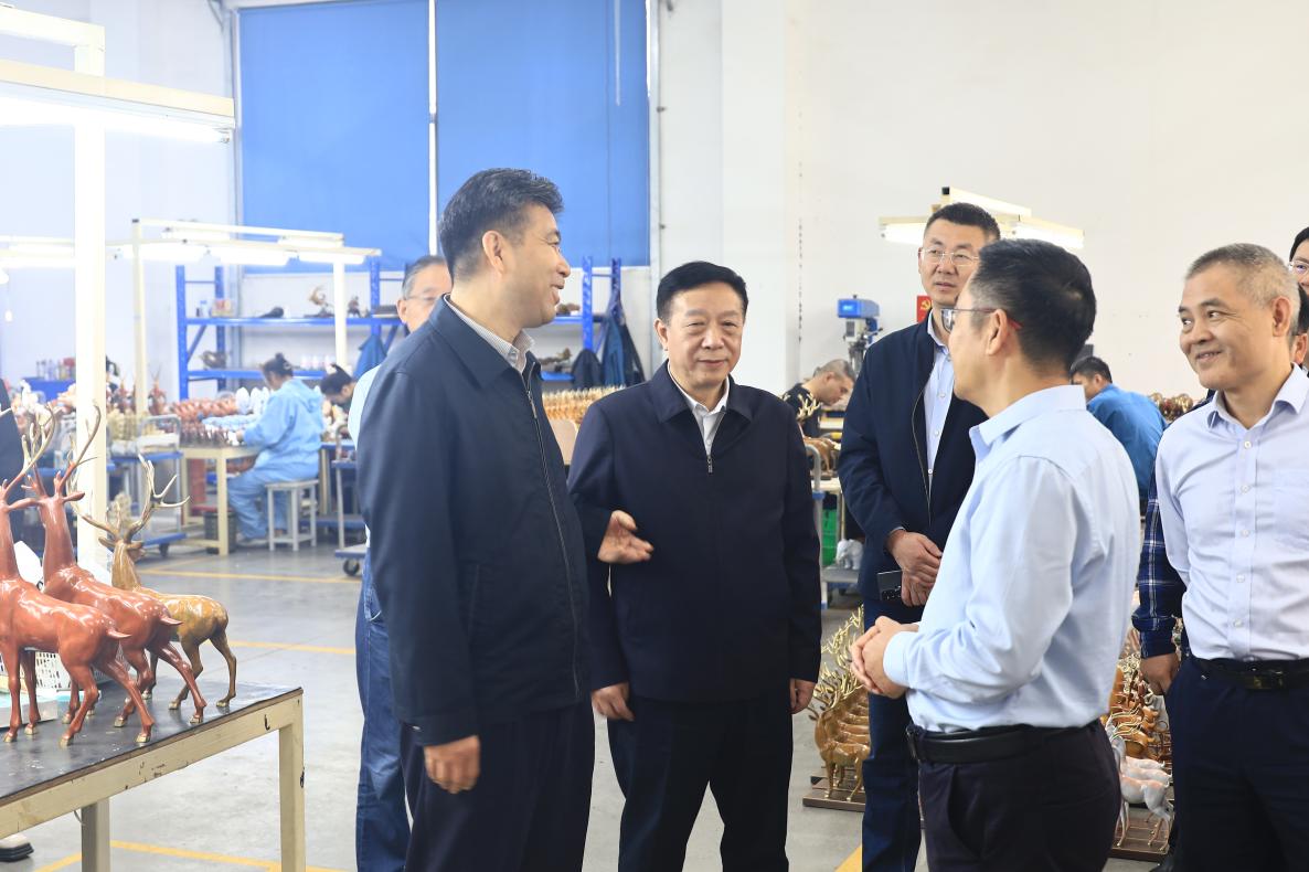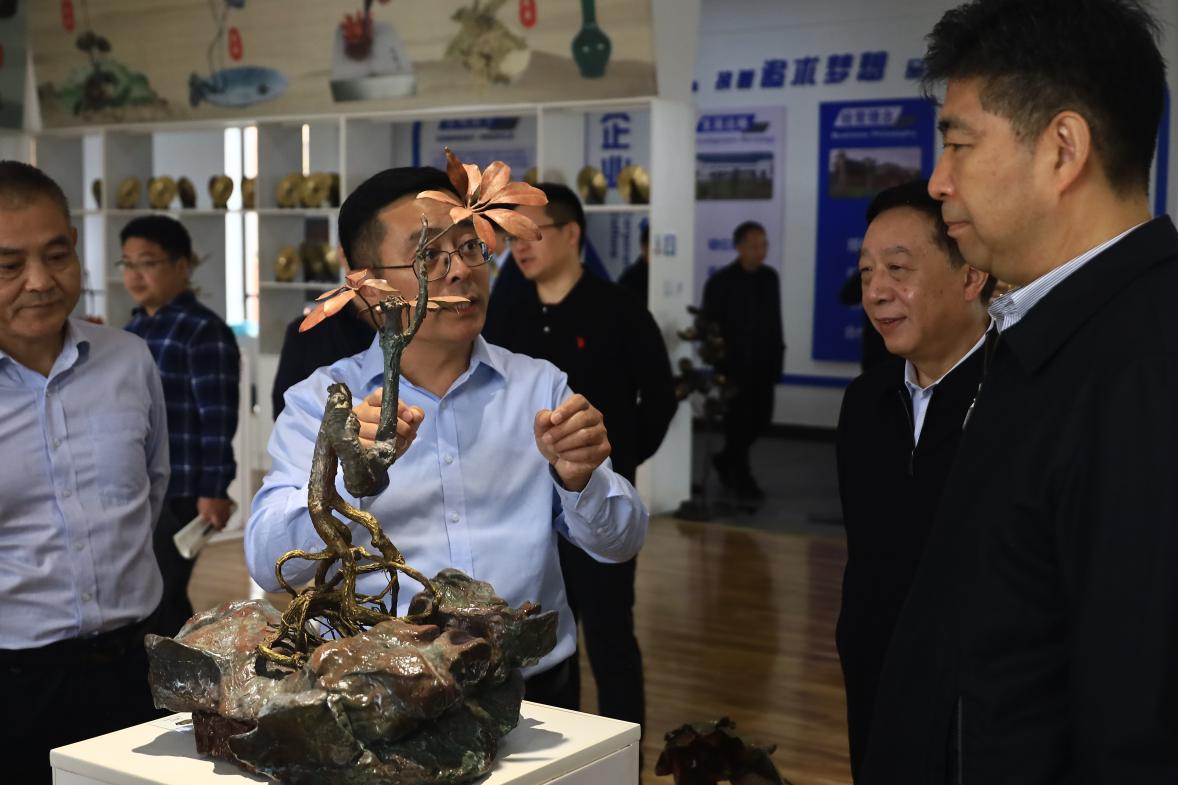 公司負責(zé)人郭飛陪同參觀并匯報了企業(yè)生產(chǎn)經(jīng)營、市場銷售、非遺技藝傳承等情況。調(diào)研組深入車間詳細了解銅工藝品制作技藝、工藝傳承創(chuàng)新,曲福田副主任對我公司把傳統(tǒng)工藝和現(xiàn)代創(chuàng)意有機結(jié)合做法給予充分肯定,并就優(yōu)化產(chǎn)品結(jié)構(gòu)、提升產(chǎn)品競爭力與公司負責(zé)人進行交流探討,他希望銅官府進一步強化品牌培育,用匠心延續(xù)銅工藝的“金”字招牌。